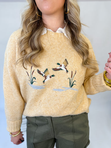 A playful twist on cozy chic, this embroidered duck knit sweater is designed to bring warmth and charm to your wardrobe. With its soft knit blend a...