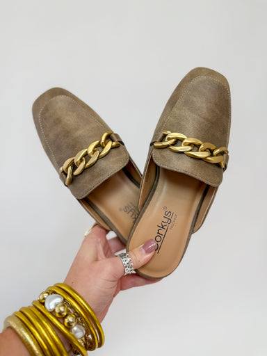 Introducing the [Corky's] Clingy Mule! These Khaki Faux Suede shoes feature a cute knot detail that will add a touch of whimsy to any outfit. The o...