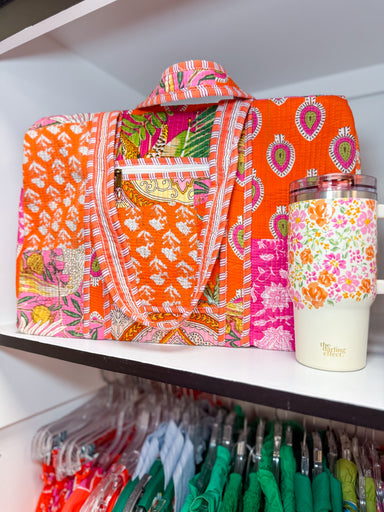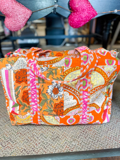 Make a statement on the go with the Sunset Flora Quilted Duffle Bag, a beautifully handcrafted piece designed for stylish travel. Featuring a vibra...