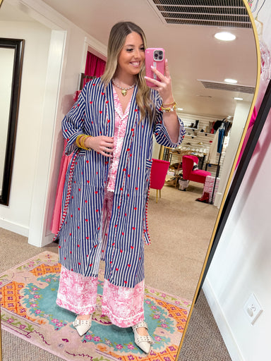 Start your day in cozy, playful style with the Love Lines Robe by The Roots. Featuring a classic blue-and-white stripe accented with charming red h...