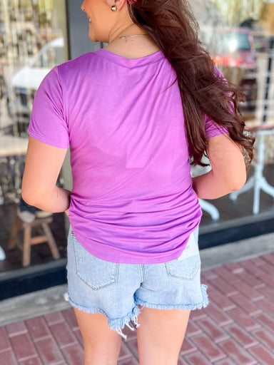 Introducing the Rhea Pocket Tee in Bubblegum! This playful V-neck tee features a convenient pocket for all your essentials. Stay stylish and organi...