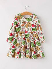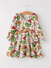 Bring holiday cheer to her wardrobe with our Winter Christmas Character Cookie Print Girls Dress! Adorned with delightful cookie and Christmas-them...