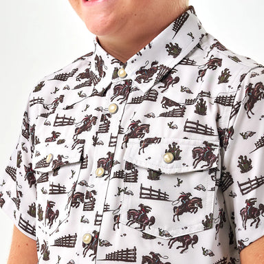This youth western shirt merges classic cowboy aesthetics with contemporary athletic engineering. The 90% polyester and 10% spandex construction de...