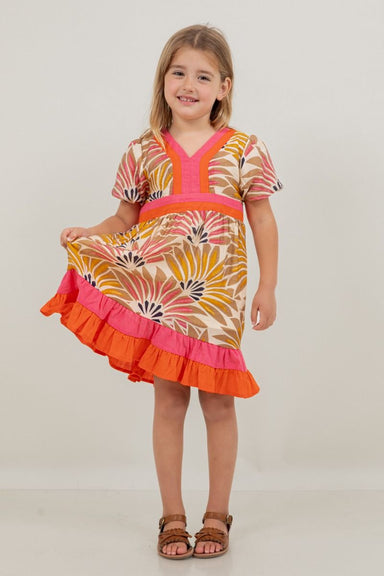 The Summer Palm Youth Dress features a vibrant palm print in shades of brown, terra cotta, orange, and pink. It showcases a v-neckline and empire w...