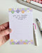 Brighten your workspace with the Happy Daisy Notepad. Each page is adorned with hand-drawn, smiling daisies, creating a cheerful spot for jotting down notes, to-dos, or daily thoughts. This charming notepad adds a playful touch to your desk while keeping your day beautifully organized.
