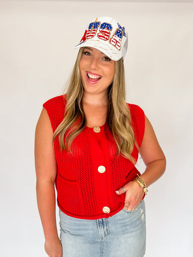 Unleash your playful side with our Carmine Sweater Vest in fiery red. This Women's Button Down Vest features a classic design and handy pockets for...