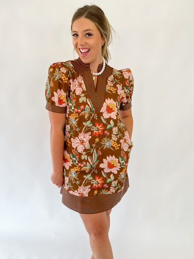 The Fall Meadow Mini Dress showcases a brown base adorned with a floral print and charming short puff sleeves. It highlights a stitched contrast ba...