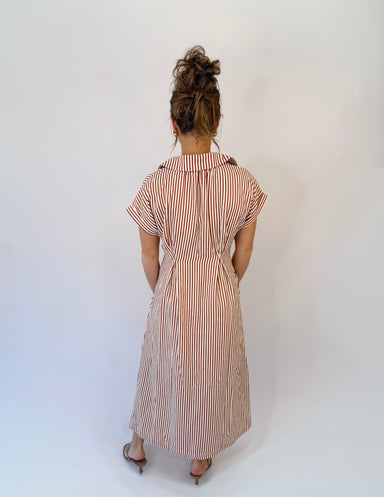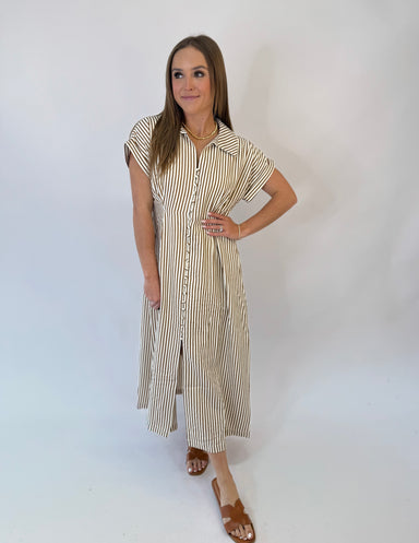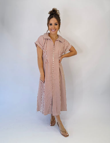 Crisp stripes meet timeless tailoring in this short sleeve midi dress. Designed with a classic shirt collar and a softly pleated waist seam, it cre...