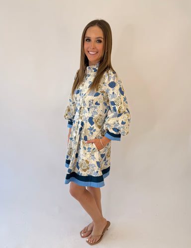 Playful and feminine, this floral print mini dress features a classic collar with button-front closure and ¾ bubble sleeves accented by pintuck det...