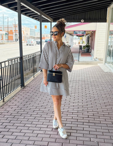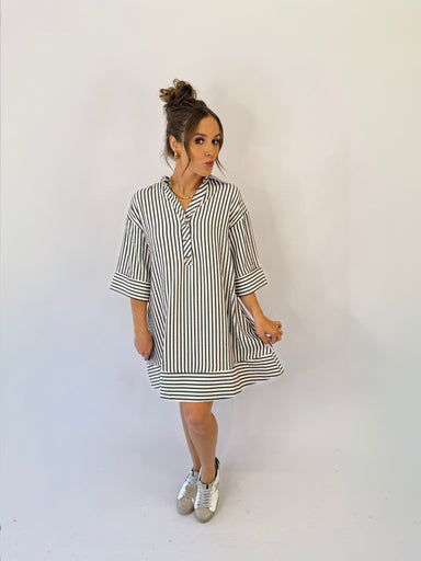Timeless and chic, this stripe-pattern mini dress features ¾ cuff sleeves, a spread collar, and a button-front closure for classic appeal. Pleating...