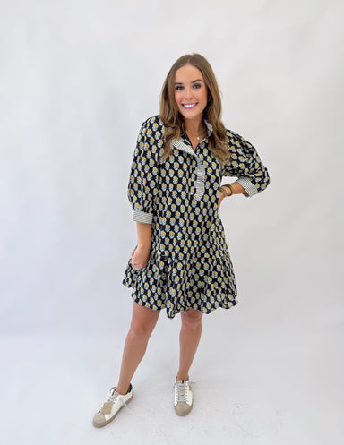 Feminine and playful, this floral mini dress features ¾ cuff sleeves and a pleated hem for subtle movement. A striped ruffle band frames the neckli...