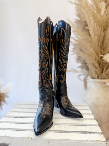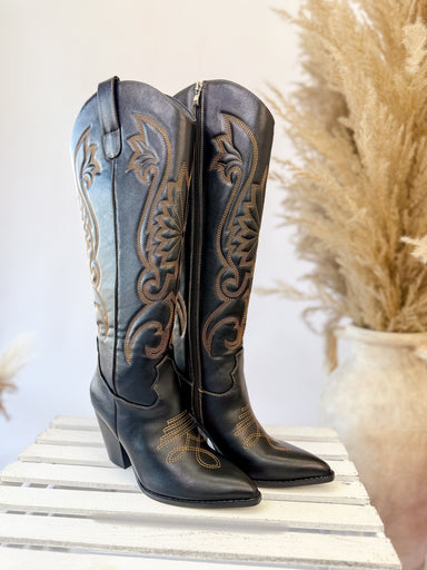 Meet your new showstopper boot—a knee-high western classic designed to turn heads. With its intricate stitching, sleek black finish, and a sturdy b...
