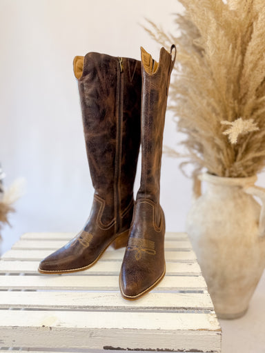 Step into the spotlight with these distressed brown western boots, combining instant edge with all-day comfort. Featuring a weathered finish and co...