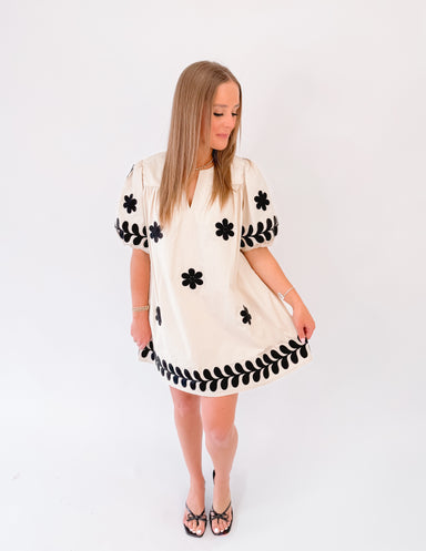 The Fall Meadow Mini Dress showcases a brown base adorned with a floral print and charming short puff sleeves. It highlights a stitched contrast ba...