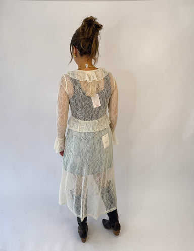Floaty and feminine, this lightweight sheer lace duster features a delicate floral pattern and a longline silhouette. Cascading ruffle trim down th...