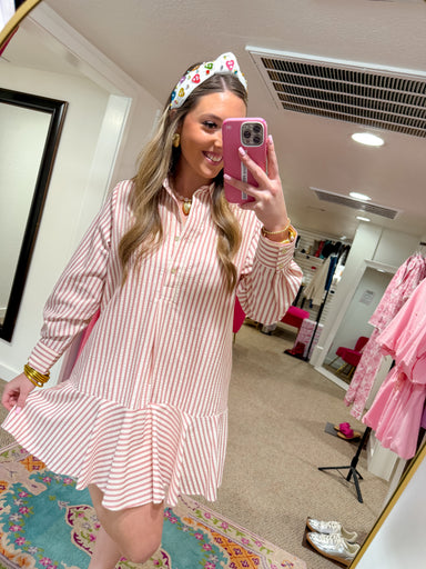 Experience the Cape Cod Breeze Dress with 2 front pockets, short sleeves, and a flirty flare design in pink and white stripes. The concealed button...