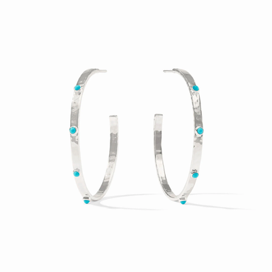 Statement-making yet elegant, these hoops feature reconstituted turquoise blue stones set in tarnish-resistant pure silver plate. Finished with Jul...