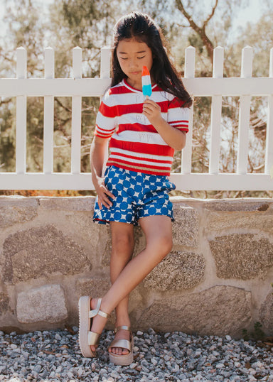 Step into style with Somersault Shorts. These red and white ruffle shorts add a playful touch to any outfit. Perfect for big girls, these pin strip...