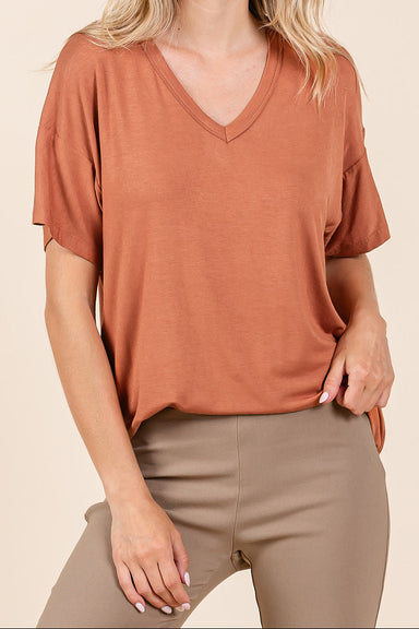 Unleash your playful side with our Soft Essentials Tee in vibrant Rust. Made from bamboo knit fabric, this oversized tee features a V-neck, drop sh...