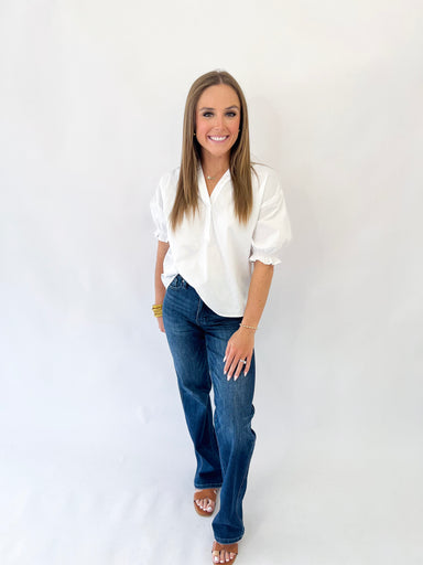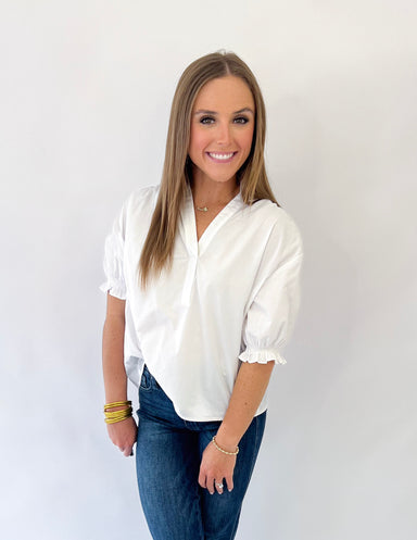 Say hello to your new favorite statement top! Featuring a flirty V-neck, delicate ruffle details, and short puff sleeves with a multicolor band acc...