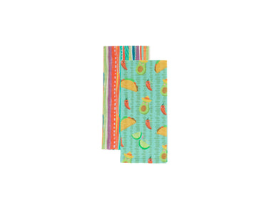 Add some spice and color to your kitchen with this festive set of 2 cotton tea towels. One towel features a playful pattern of smiling tacos, limes...