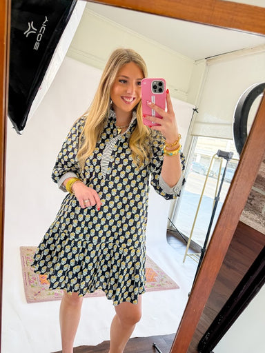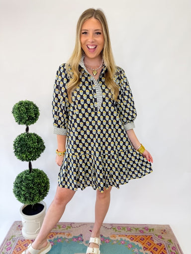 The Playful Accent Floral Mini Dress features a lined design with a collared v-neckline and front buttons for easy style. Half sleeves add a bree...