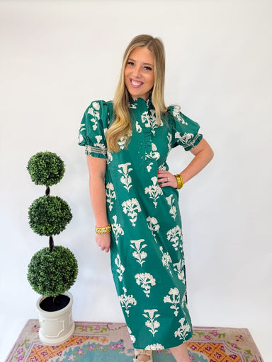 Fresh and feminine, this botanical print midi dress features short puff sleeves and a ruffled neckline with a partial button-front closure. The tie...
