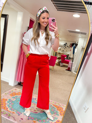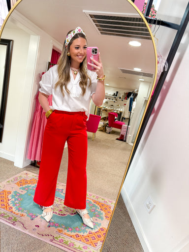 Experience the ultimate in professional style with our Executive Elegance Pants in vibrant red! Featuring pintuck detailing and a wide leg design, ...