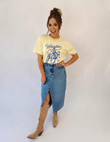 For the free spirits and wild hearts. The Wander Wide Boy Tee comes in a soft butter yellow with a bold blue graphic featuring a cowgirl on horseba...
