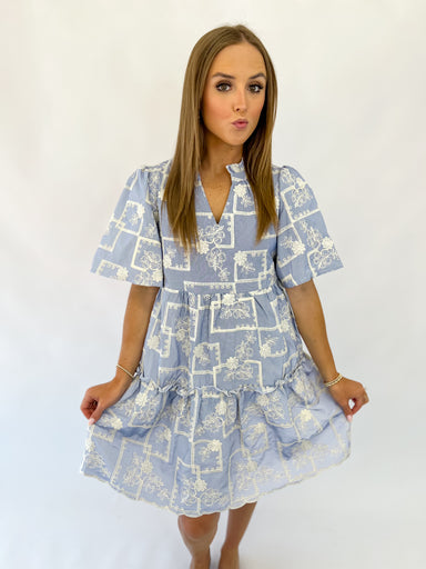 Playful and charming, the Sweet Thing Dress in light blue and ecru is your new favorite. It features a v-neckline with a subtle ruffle trim and sho...