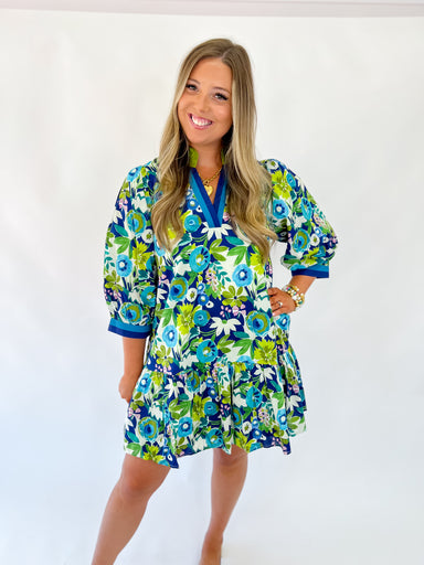 Feminine and fun, this mini dress features a vibrant multi-floral pattern and a flattering ¾ sleeve silhouette. Designed with a ruffle hem and a mu...