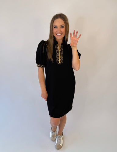 A playful twist on a classic silhouette, this solid mini dress features short puff sleeves and a statement collar finished with bold leopard print ...